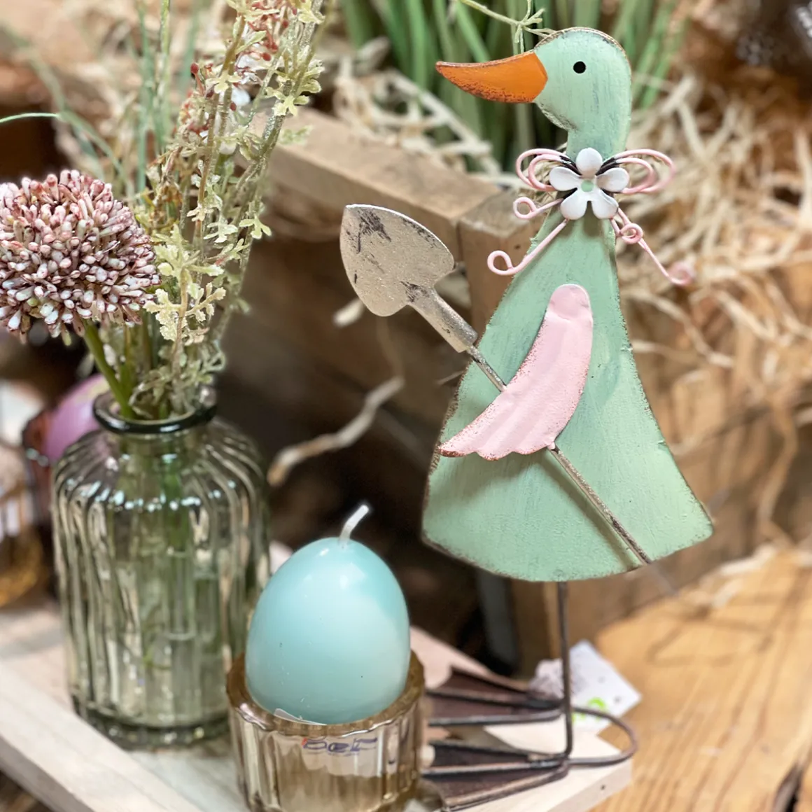 Deko Ente mit Schaufel, grün, 20cm, Metall