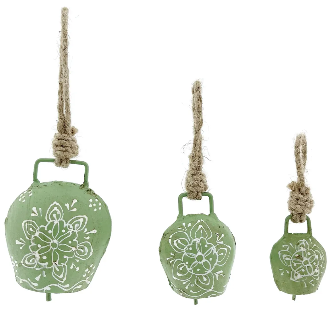 Deko Glocke grün mit Klang, Kuhglocke mit Blumenmuster grün-weiß, 7cm