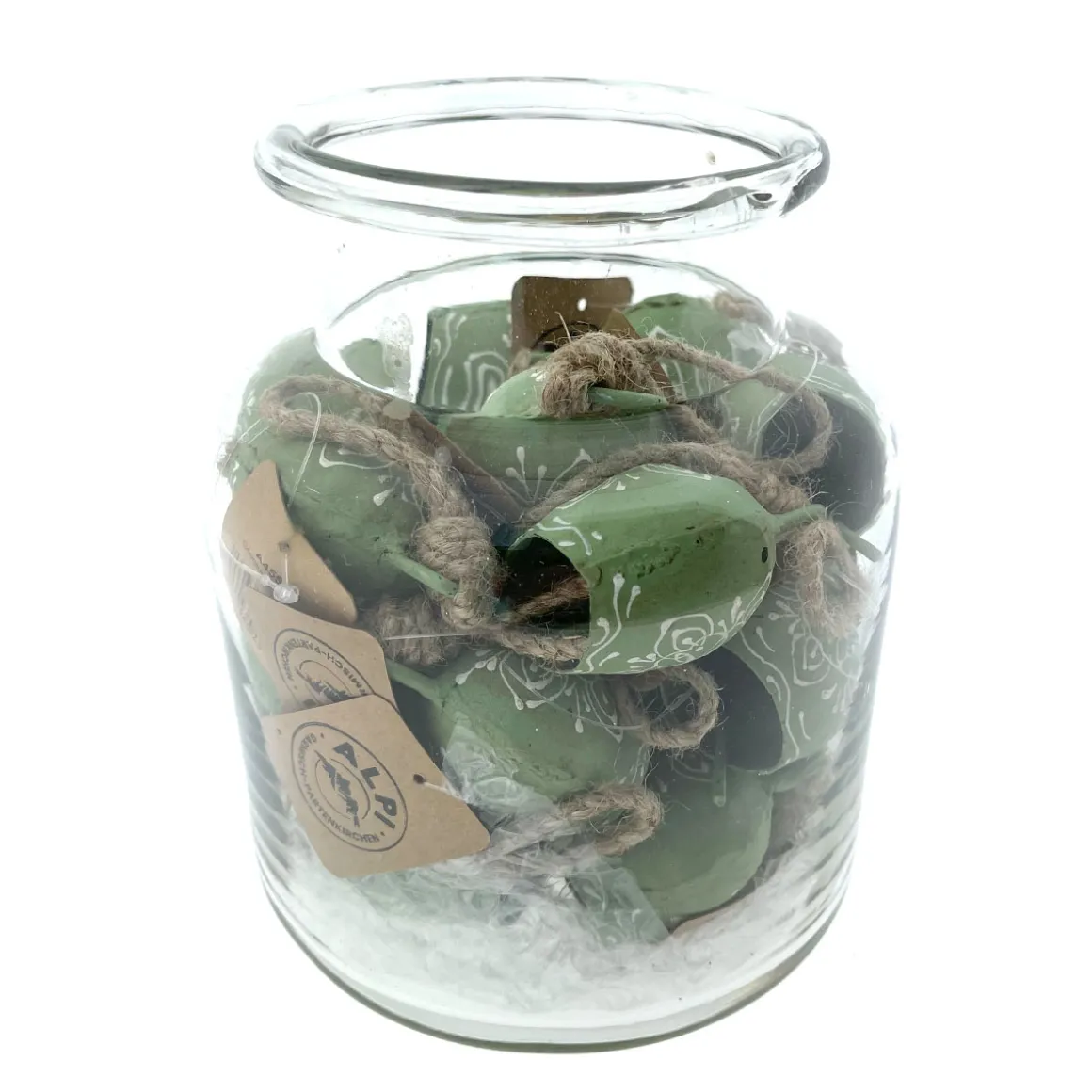 Produktinformationen „Deko Glocke grün mit Klang, Kuhglocke mit Blumenmuster grün-weiß, 7cm“