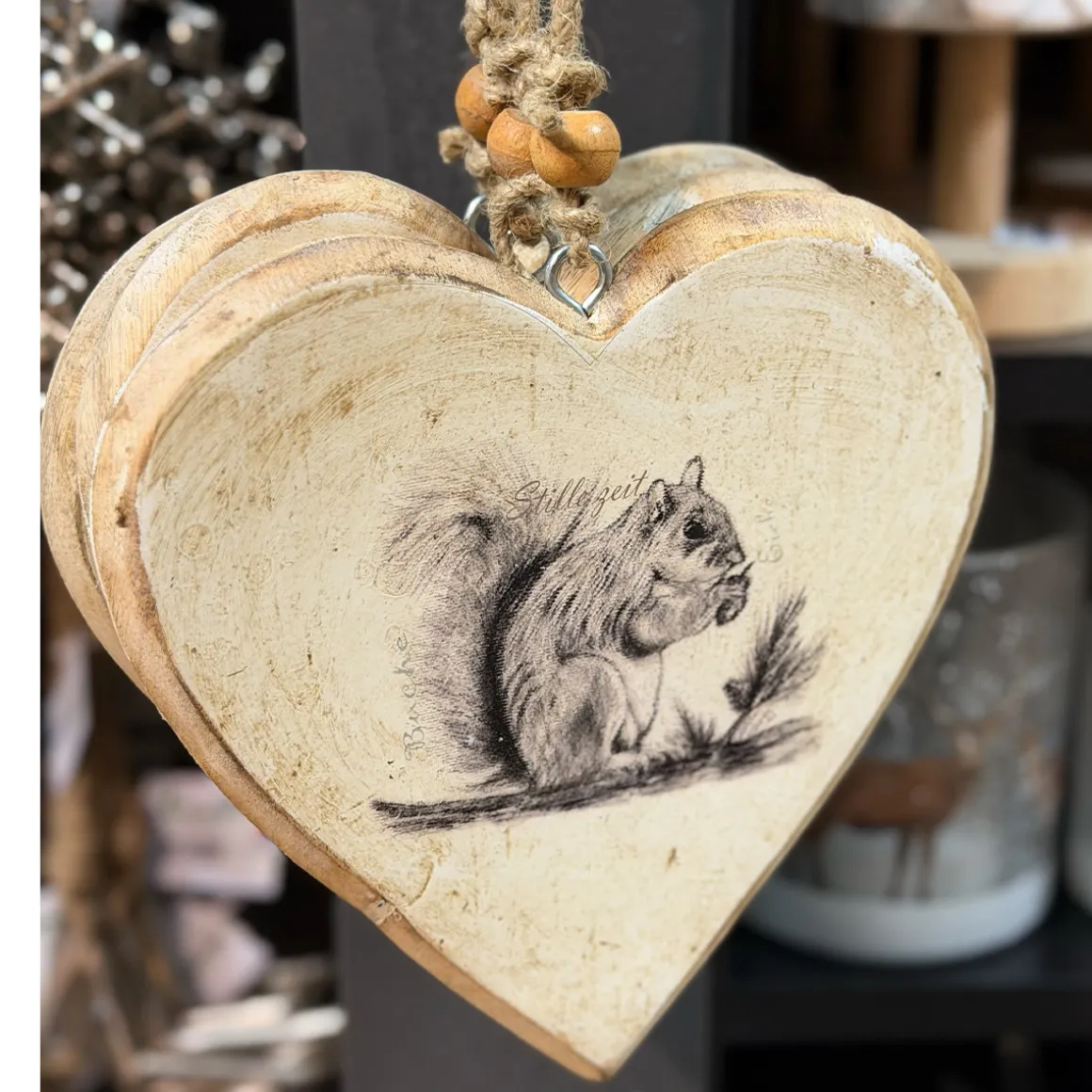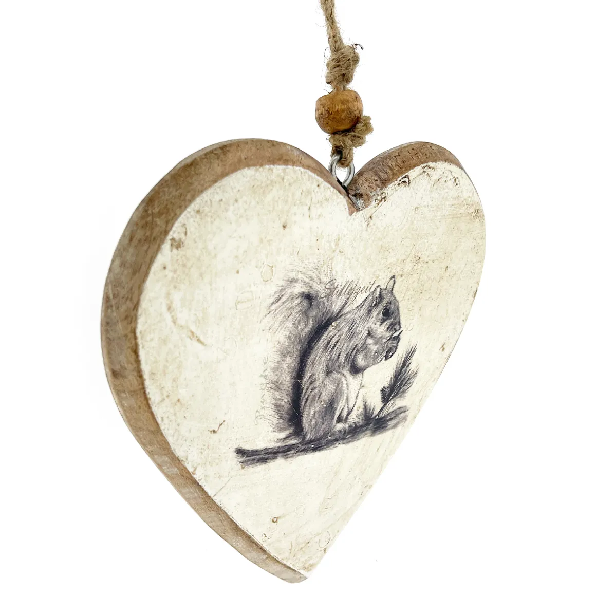 Dieses charmante Holzherz zeigt ein kleines Eichhörnchen, das – ganz vertieft und ganz leise – an seiner Nuss knabbert.