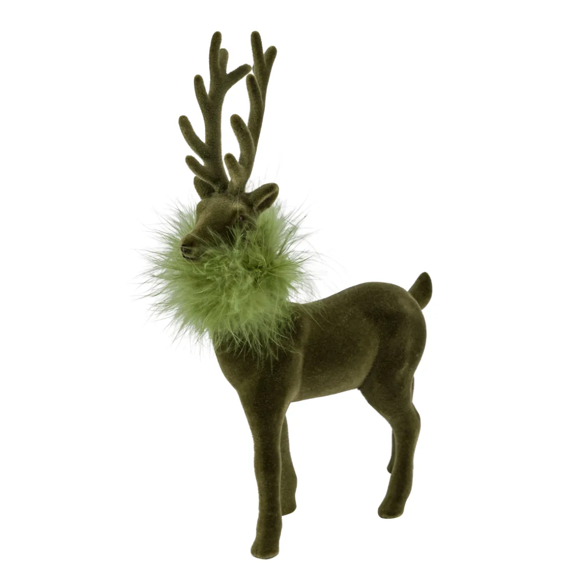 Produktinformationen „Deko Hirsch mit Federboa, großer olivgrüner Hirsch, samtig beflockt, 45cm“