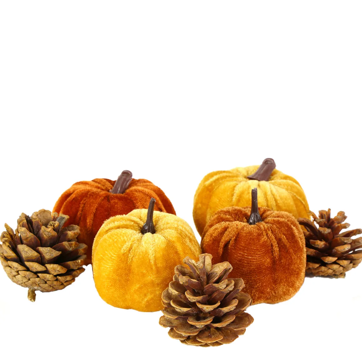 Deko Kürbis, Samtkürbisse und Zapfen, orange/braunorange, 16St/Netz