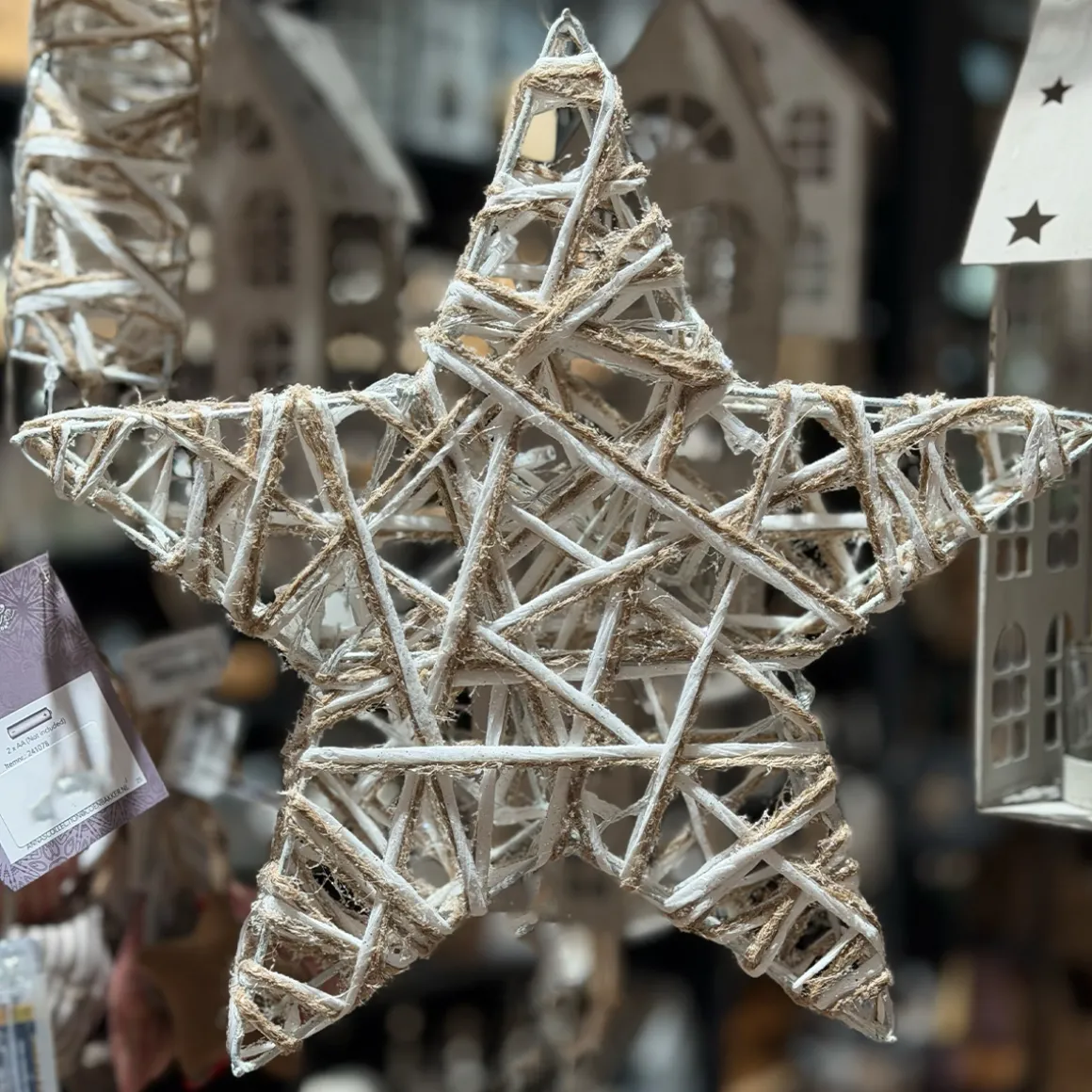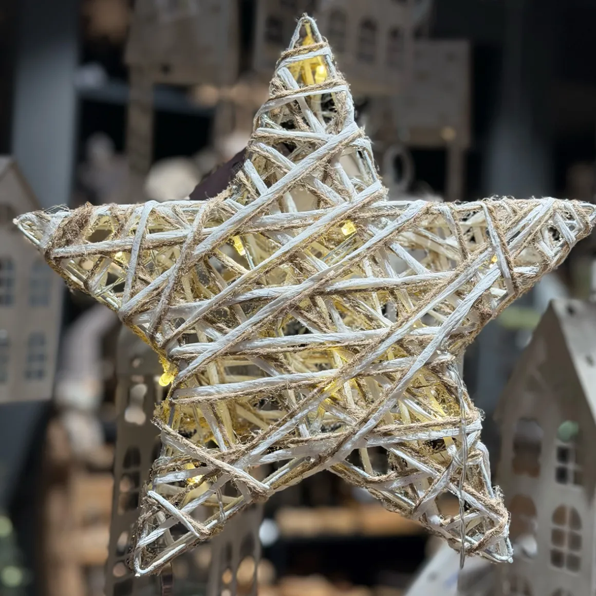 Die locker gewickelten Naturfasern lassen die 10 warmweißen LEDs weich hindurchschimmern – wie kleine Lichtpunkte, die im Winterhimmel funkeln.