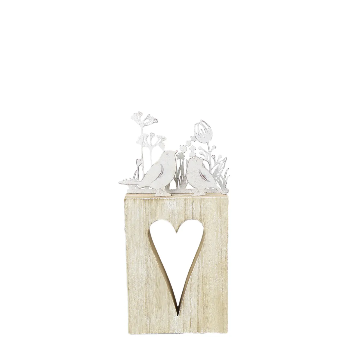 Dekoobjekt Vögel und Blumen auf Holzherz, weiß-natur, 25x11cm, Aufsteller