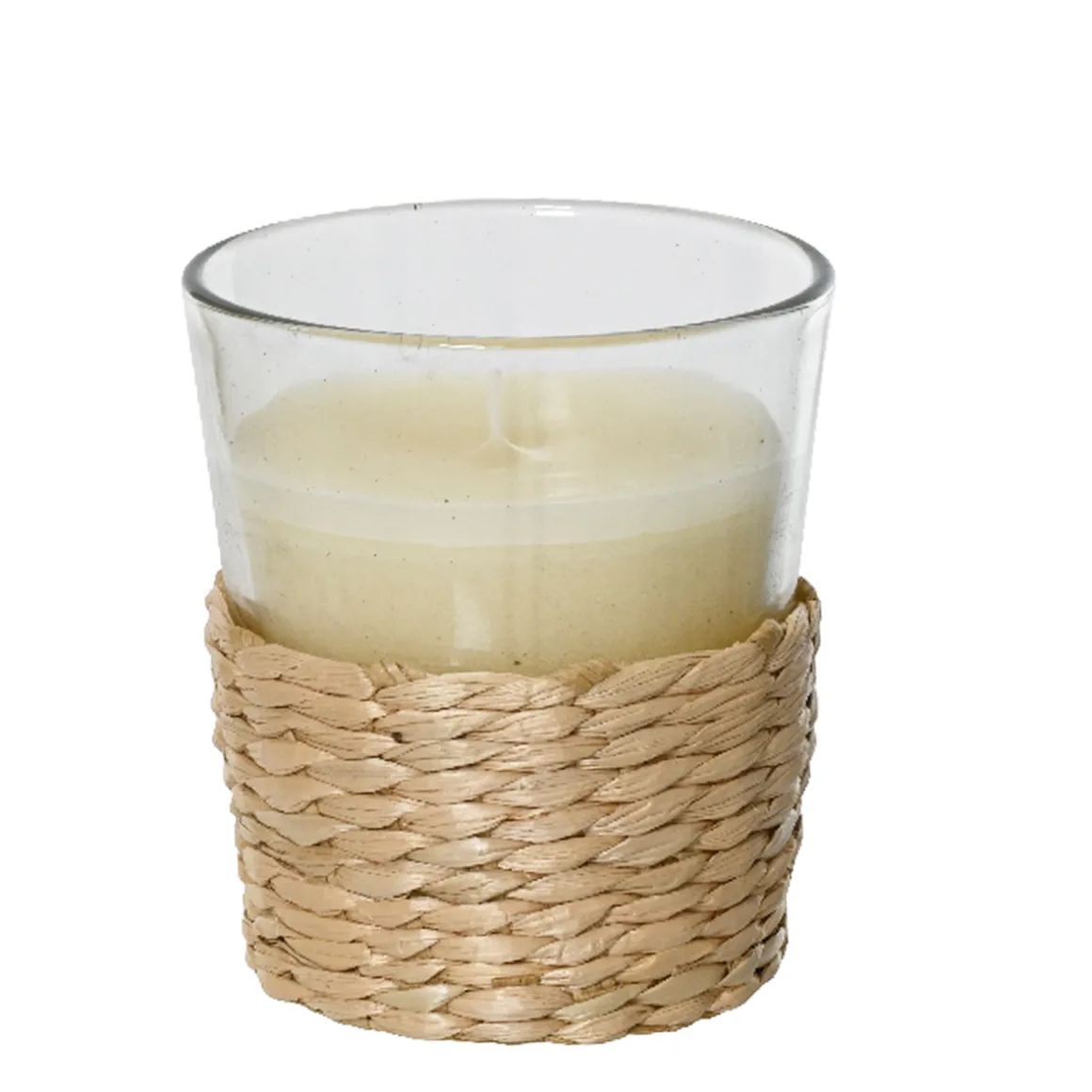 Duftkerze Citronella im Glas, Duftkerze creme im Bastkorb, outdoor, 7x7cm