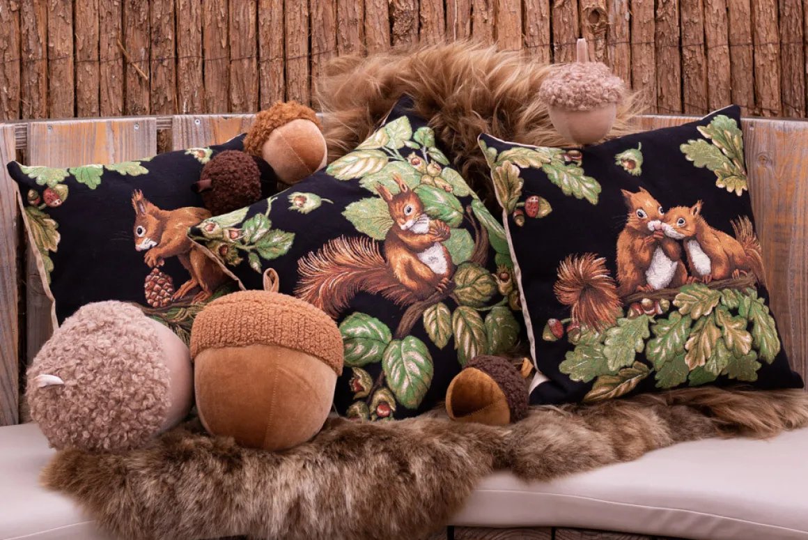Gobelin Kissen Eichhörnchen, Eichhörnchen mit Eicheln, schwarz, 45x45cm, Mars & More