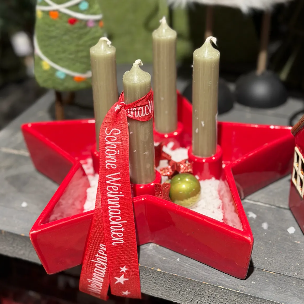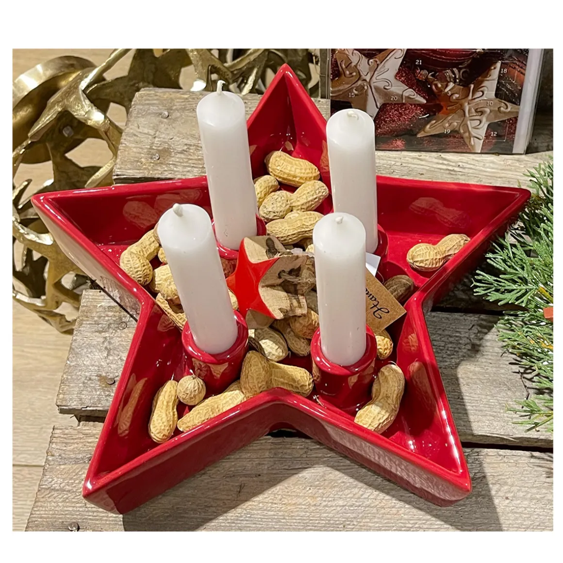 Kerzenhalter Stern, Kerzenschale rot für 4 Stabkerzen 27x25cm, Steingut