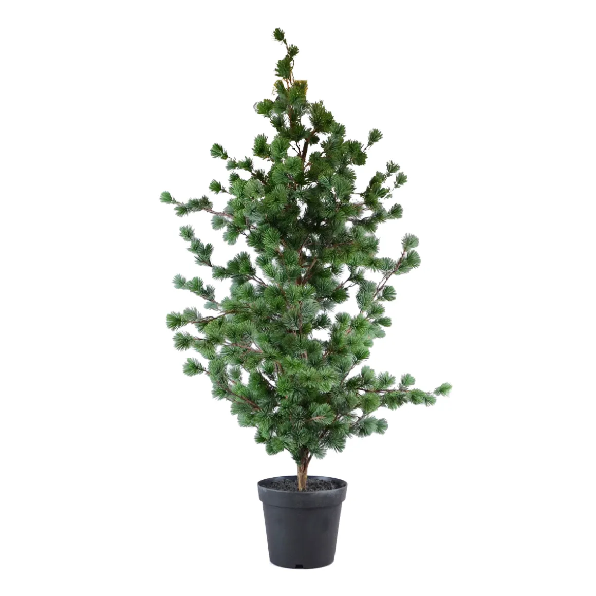 Mit seinen detailreichen, unterschiedlich langen Nadeln und den fein verzweigten Ästen wirkt er täuschend echt und sorgt für eine ruhige, natürliche Atmosphäre. Der Baum steht fest in einem schlichten schwarzen Topf und kann direkt dekoriert oder in einen Übertopf gestellt werden.
