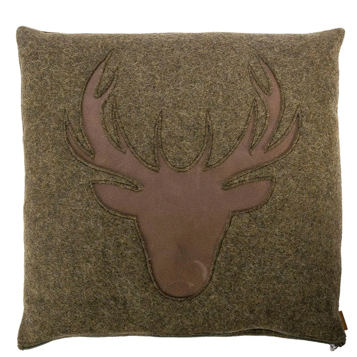 Landhaus Loden Kissen „Johann“ großes moosgrünes Filzkissen mit Lederapplikation Hirsch, 52x52cm