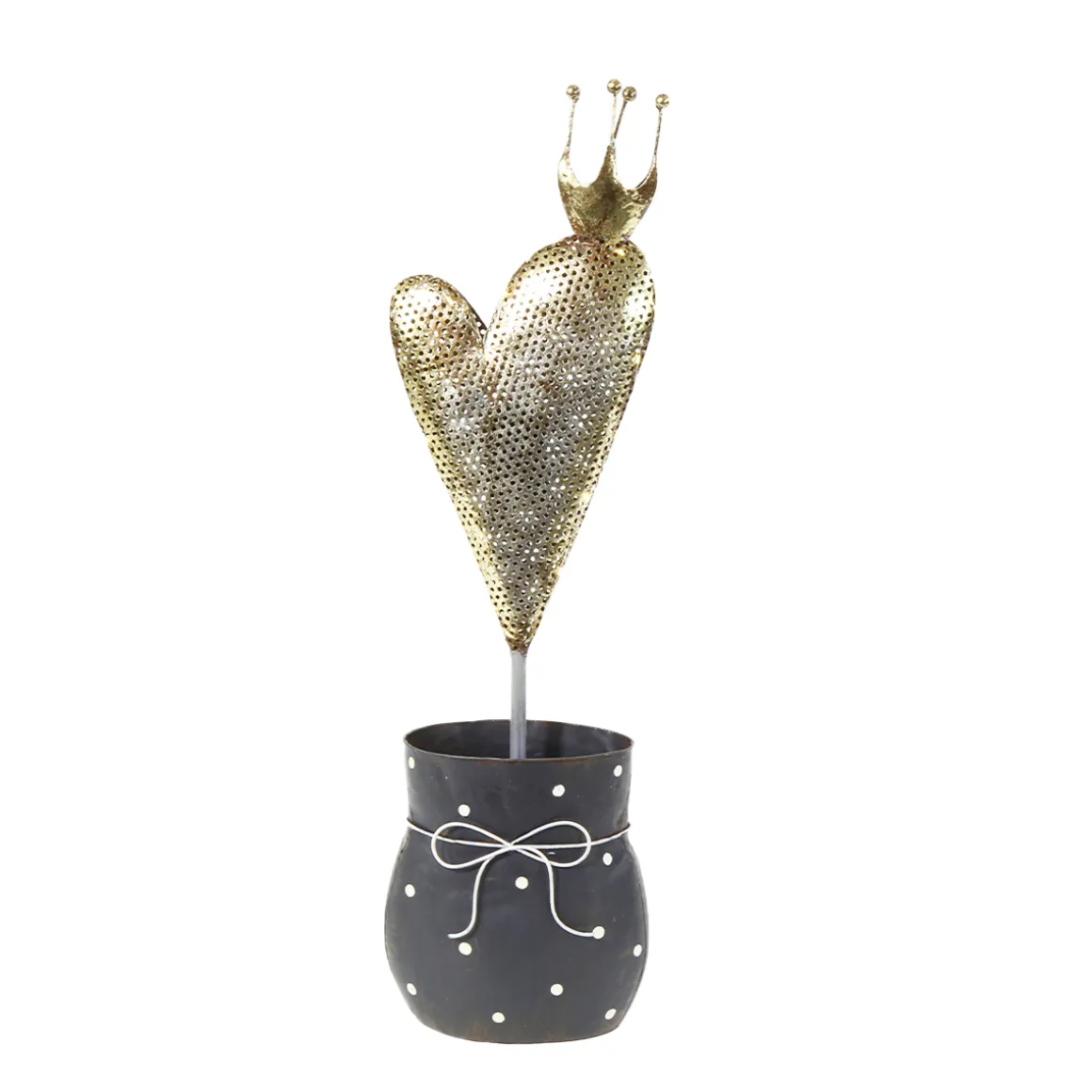 Das goldene Metallherz mit Krone steht in einem schwarzen Topf mit weißem Punktedesign und wirkt zugleich stilvoll und verspielt.