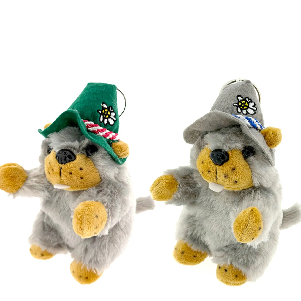 Dieses kuschelige Murmeltier trägt entweder einen grünen oder grauen Hias-Hut mit Edelweiß und weiß-blauem Hutband und ist bereit für jede Bergtour, jeden Rucksack und jedes Oktoberfest.