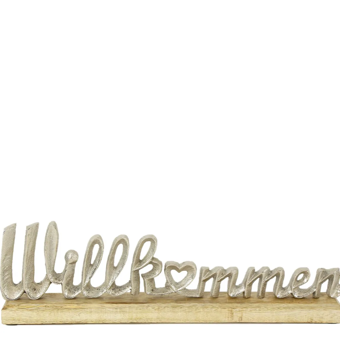 Schriftzug Willkommen, Aufsteller aus Holz mit silbernem Schriftzug, 41cm