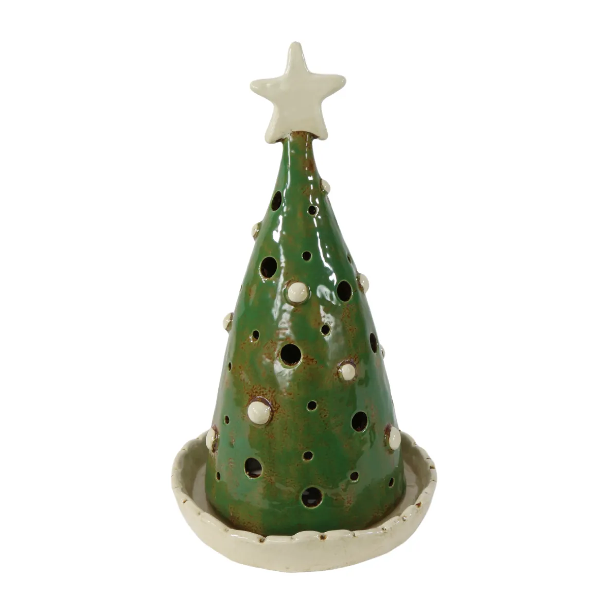 Dieser liebevoll gestaltete Keramik-Tannenbaum bringt sofort winterliche Wärme ins Zuhause. Der sanfte Grünton, die cremefarbene Sternspitze und die kleinen ausgestanzten Lichtöffnungen machen ihn zu einem stimmungsvollen Highlight in jeder Weihnachtsdekoration. In der passenden Keramikschale wirkt das Windlicht wie ein kleiner Waldmoment auf dem Tisch, Sideboard oder im Fenster.