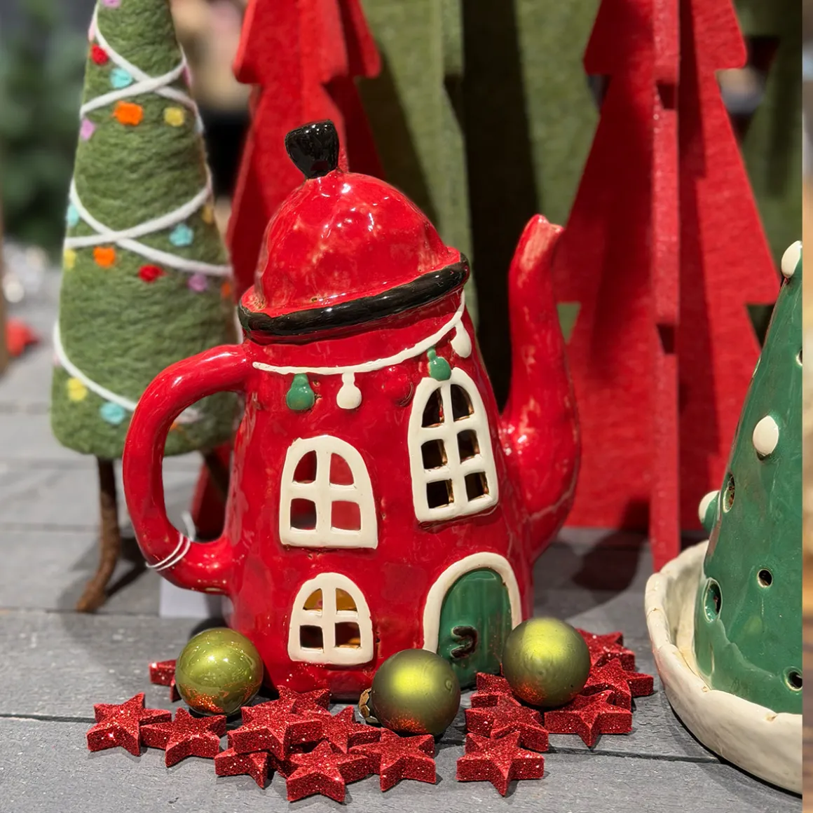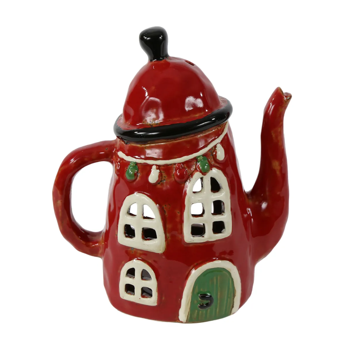 Produktinformationen „Windlicht Teekanne rot, lustiger Teekessel mit Fenster, Türe und Lichterkette“