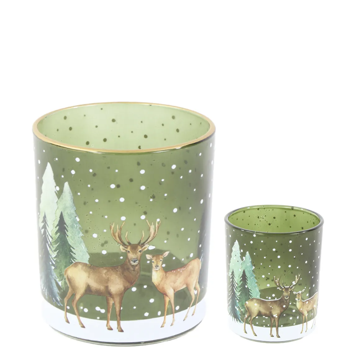 Windlichtglas Winterwald, Hirsche und Reh im Wald, grün, 7x8cm