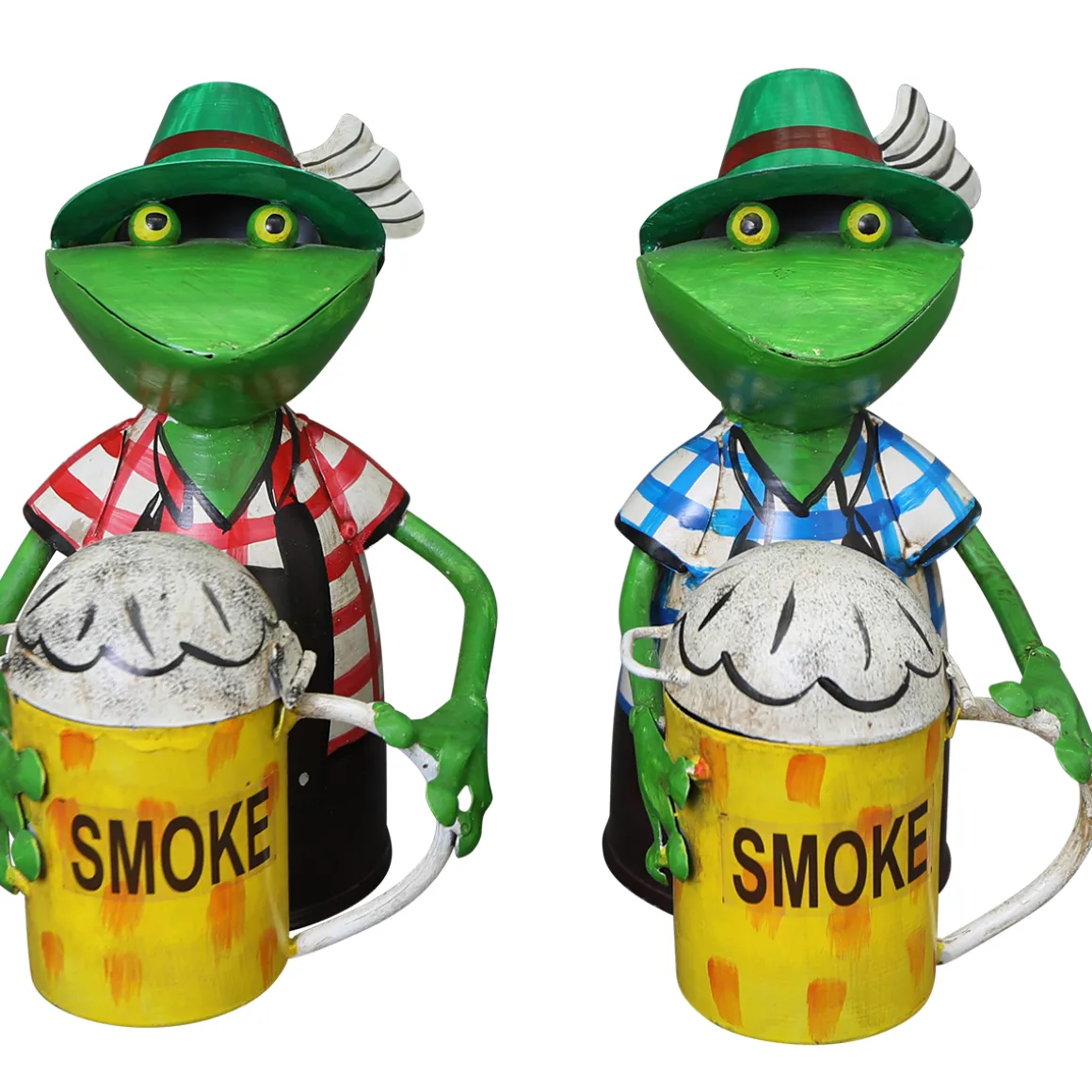 Zaunhocker Frosch Landhaus, Metallfrosch in Lederhose mit Aschenbecher Bierkrug, 22cm
