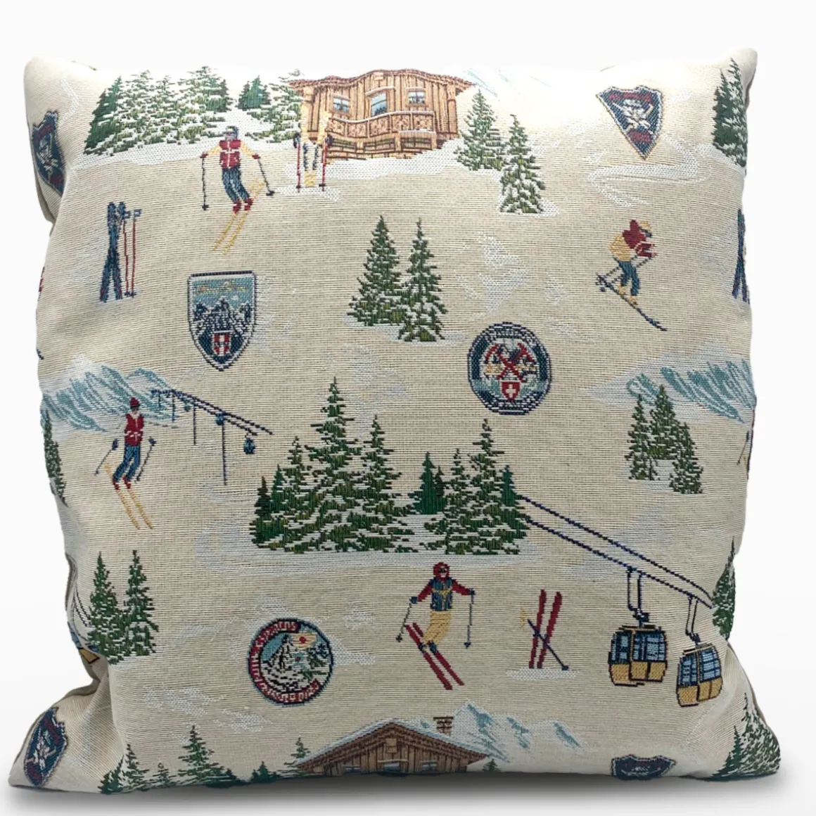 Die detailreiche Weboptik mit Skifahrern, Gondeln und Berglandschaft sorgt für eine gemütliche Winterstimmung auf Sofa, Stuhl oder Bank.