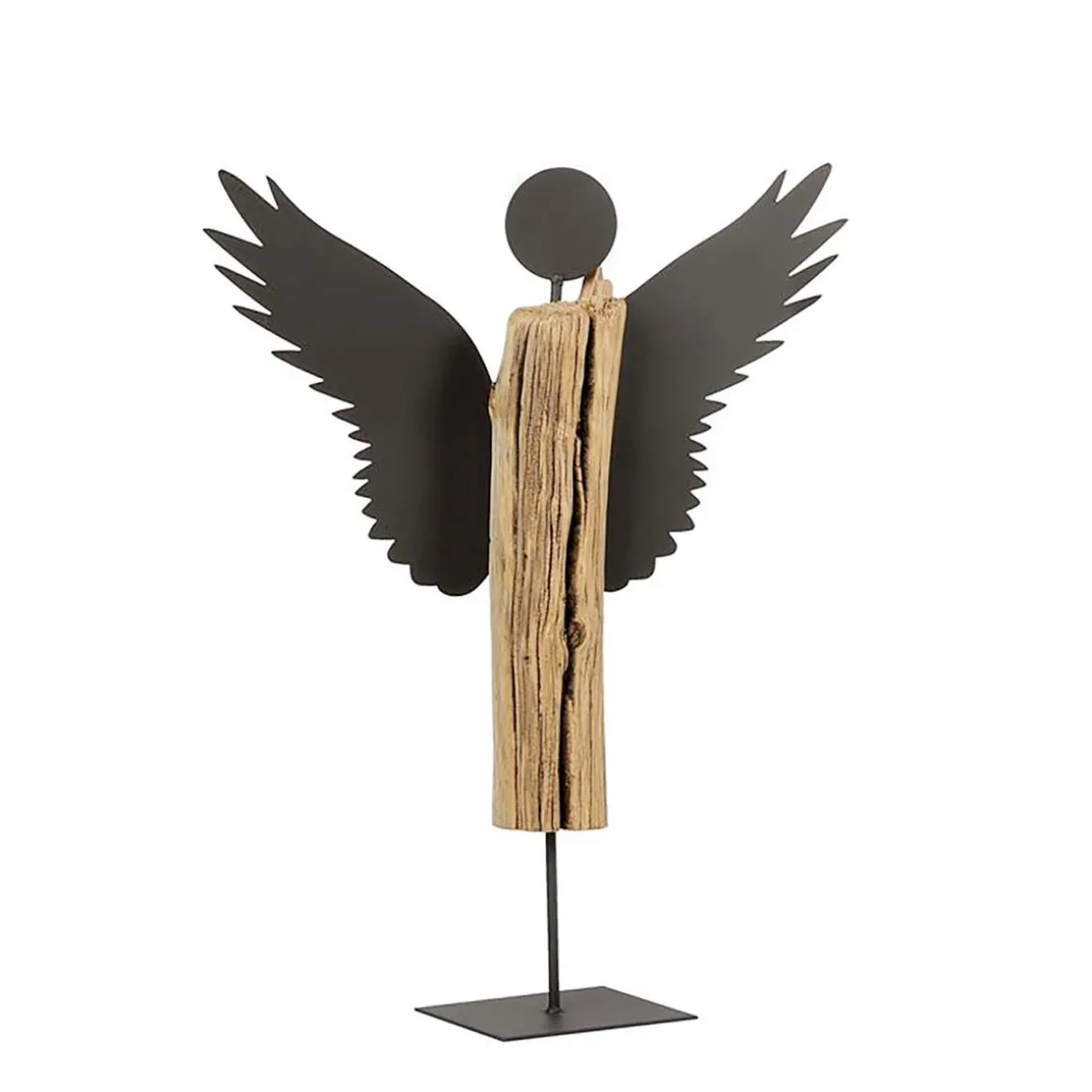 Ein liebevoll gestalteter Engel aus Naturholz und Metall, der Wärme und Ruhe in jedes Zuhause bringt.