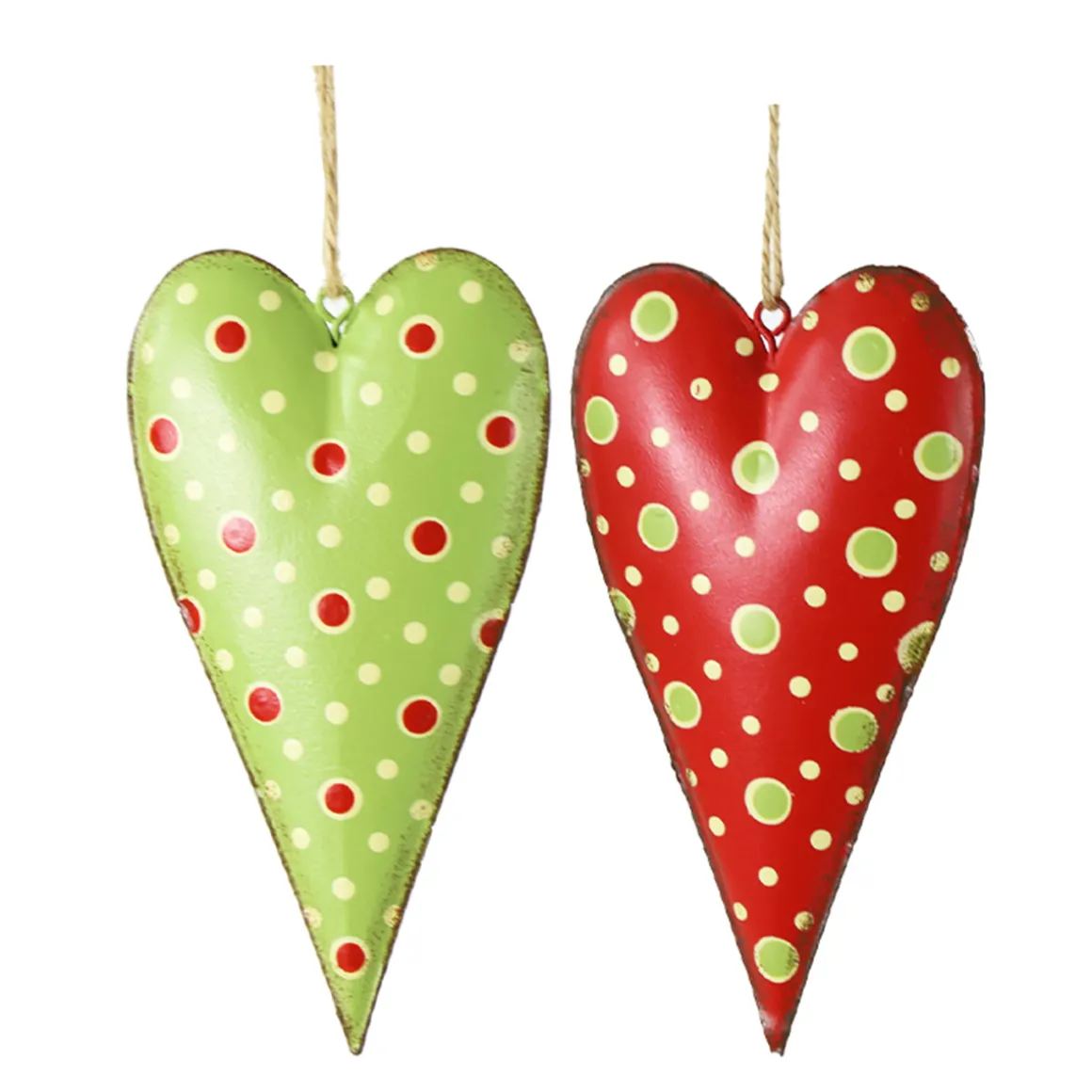 Deko Herz, Metallherz mit Punkte, rot und grün, 14cm, Hänger, Set/2