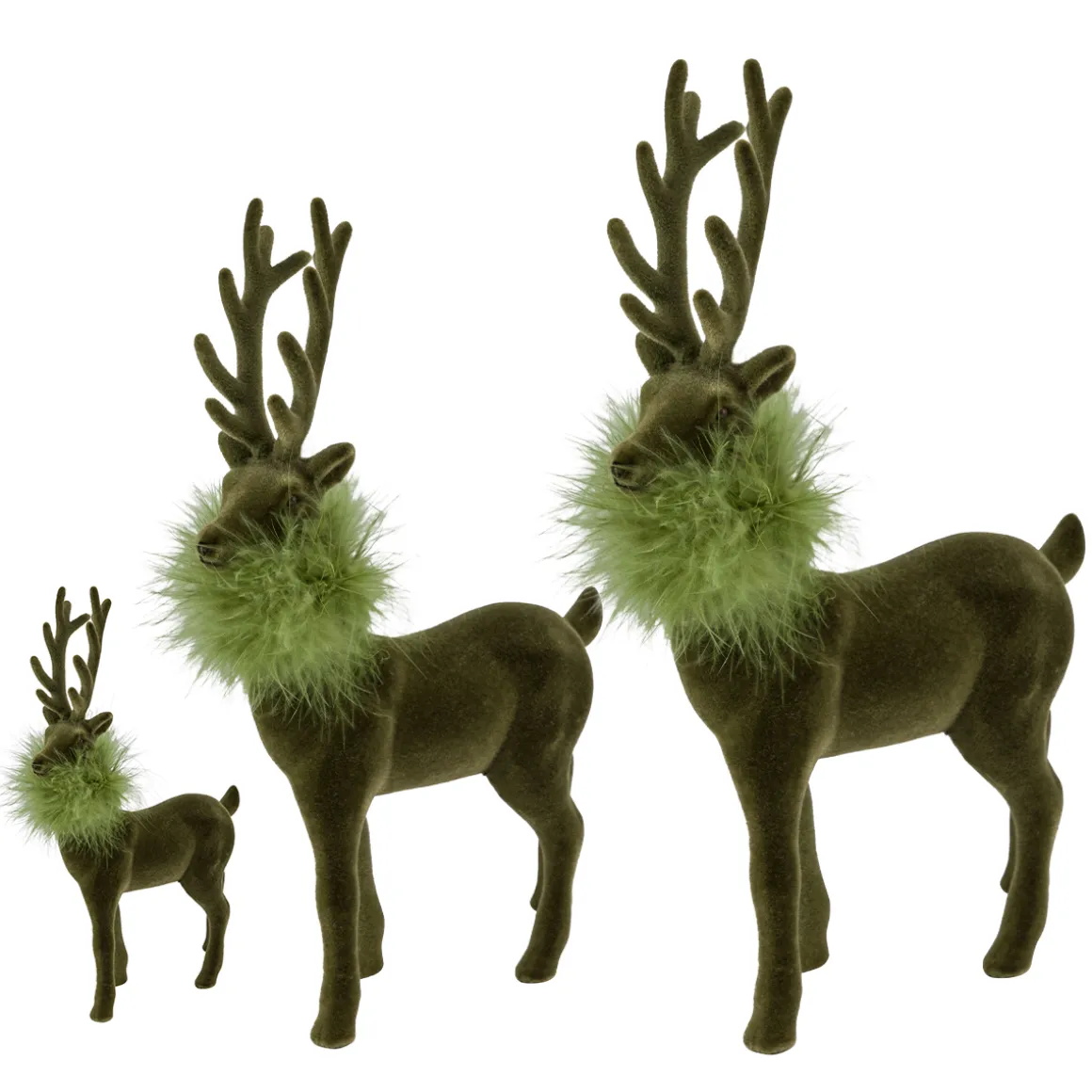 Deko Hirsch mit Federboa, olivgrüner Hirsch, samtig beflockt, 28cm
