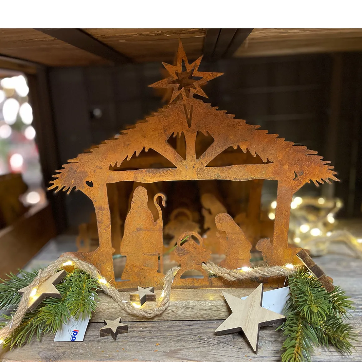 Diese liebevoll gestaltete Rostkrippe verbindet die warme, natürliche Ausstrahlung von Holz mit der charaktervollen Patina echten Edelrosts.