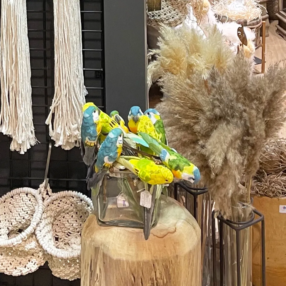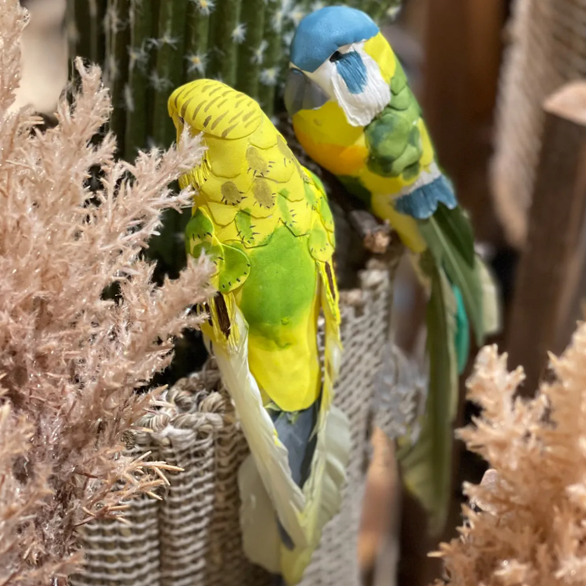 Deko Vogel bunt, Wellensittich auf Holzstange, blau-gelb-grün, 28cm