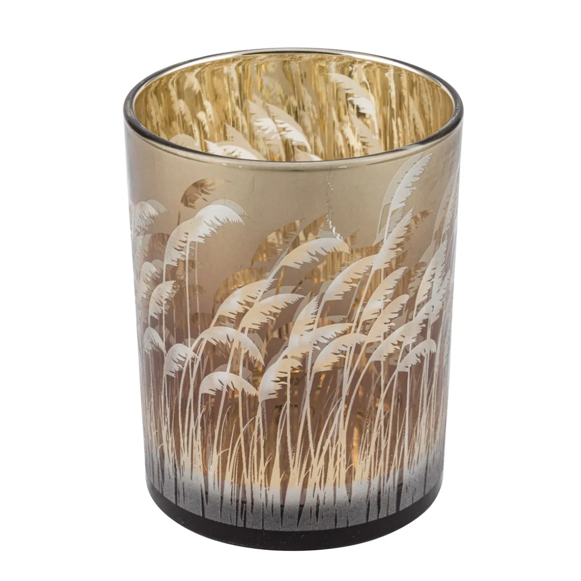 Deko Windlicht Gräser, Glaswindlicht mit Schilf-Motiv, durchscheinend, 17cm
