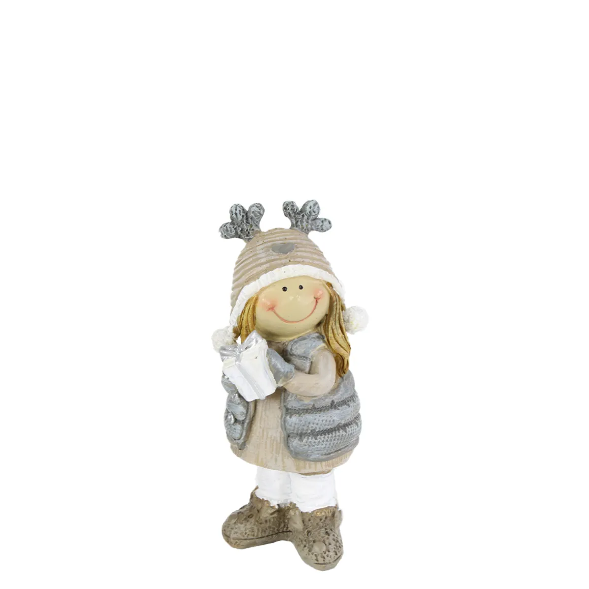 Deko Winterkind Mädchen mit Geschenk, Wintermädchen mit Mütze und Weste, 10cm