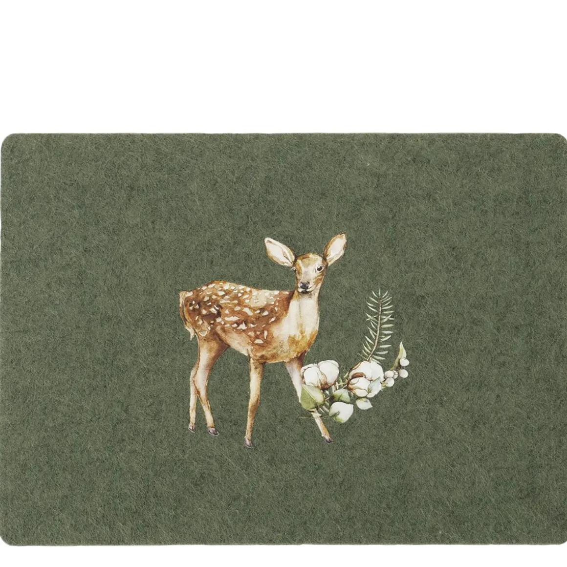 Dieses Tischset aus Filz zeigt ein kleines Bambi mit zarten Blüten und bringt damit natürliche Wärme und einen liebevollen Akzent auf deinen gedeckten Tisch. Der satte Grünton und das detailreiche Motiv passen wunderbar zu gemütlichen Wohnstilen und einer herbstlichen oder winterlichen Tischdekoration. Das Filzmaterial wirkt weich und angenehm, schützt gleichzeitig deine Tischoberfläche und lässt sich vielseitig kombinieren, ob im Alltag oder zu festlichen Anlässen.