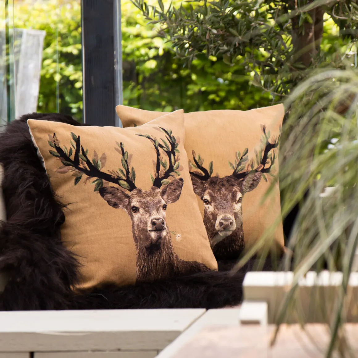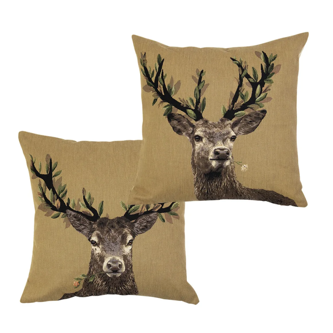 Gobelin Kissen Hirsch, Hirsch mit weißer Blume und Blättergeweih, 45x45cm, Mars & More