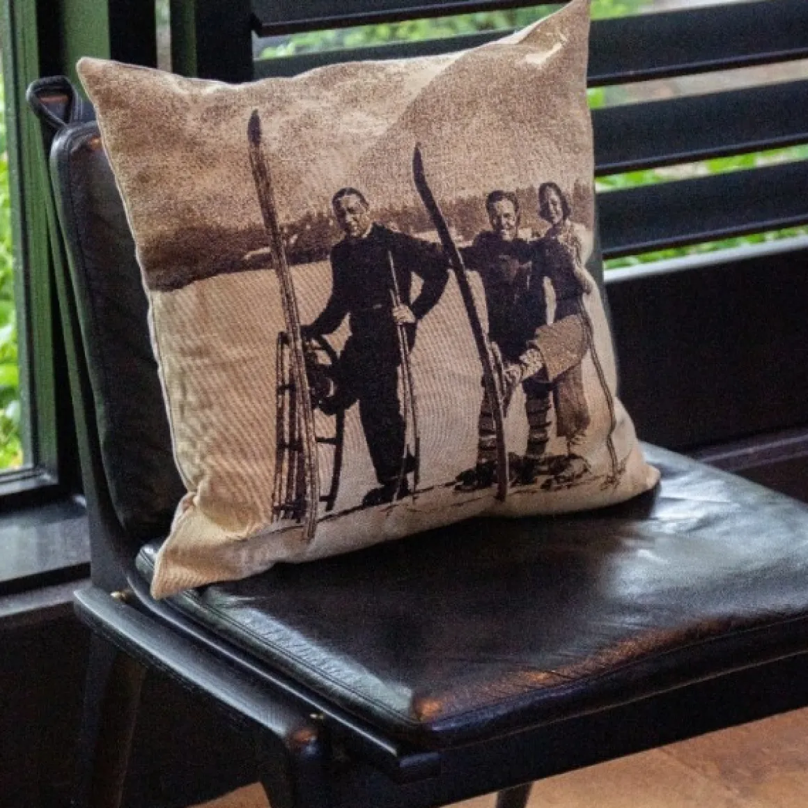 Dieses nostalgische Gobelin-Kissen entführt dich direkt in eine andere Zeit – dorthin, wo Wintertage noch nach knirschendem Schnee, eisiger Bergluft und echter Abenteuerlust rochen.