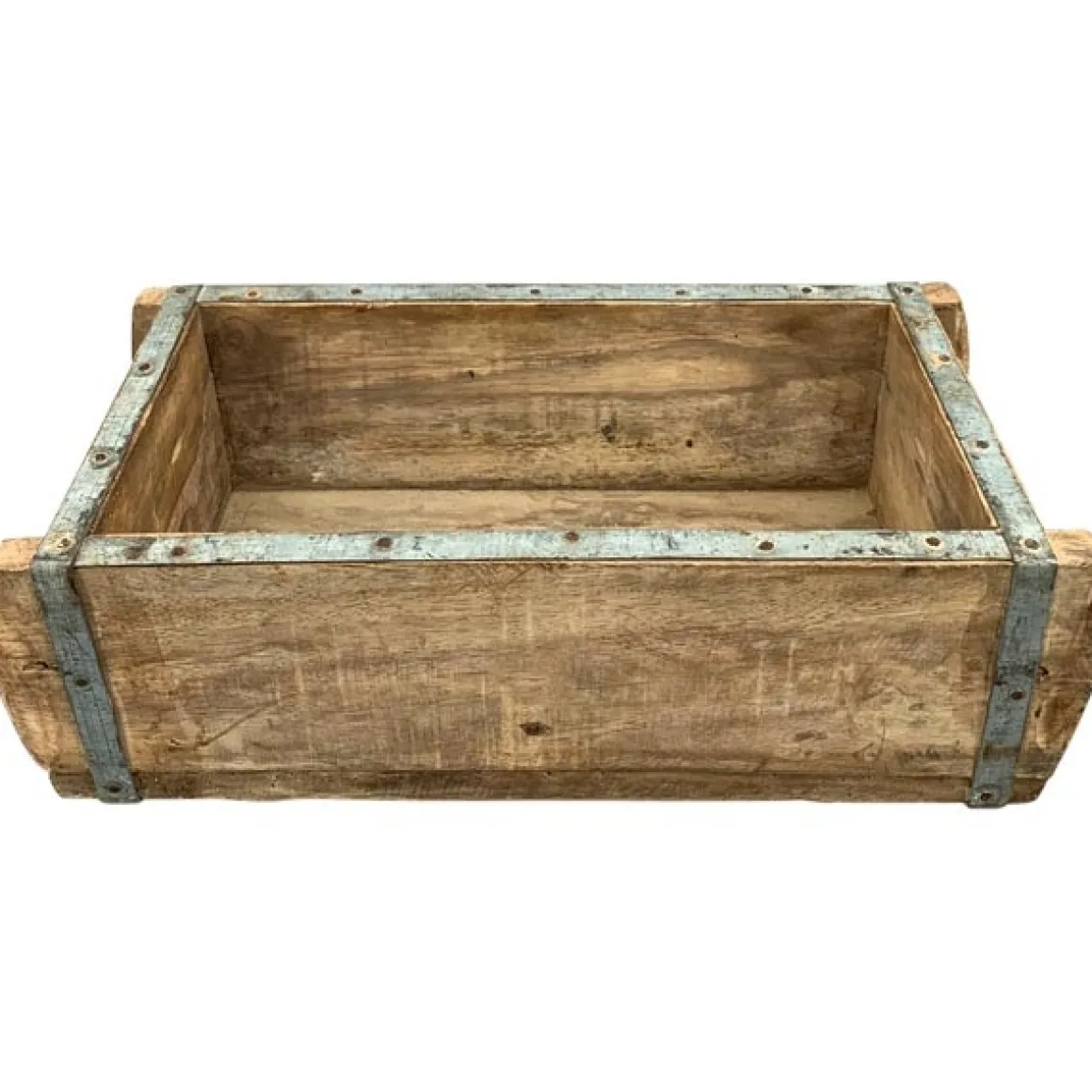 Gefertigt aus naturbelassenem, antikem Holz und mit Metallbändern verstärkt, strahlt sie einen echten Vintage-Charakter aus.