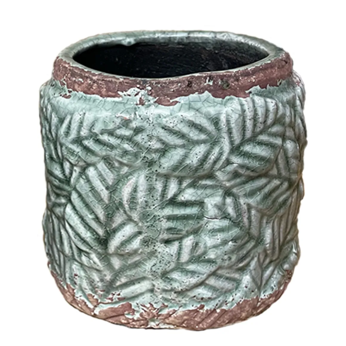 Keramik Pflanztopf Blätter Relief, Übertopf grün-terra, 11x10cm