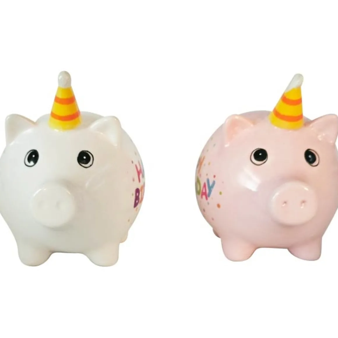 Kleine Spardose Party Schweinchen Happy Birthday, Sparschwein rosa mit Partyhut, Keramikspardose