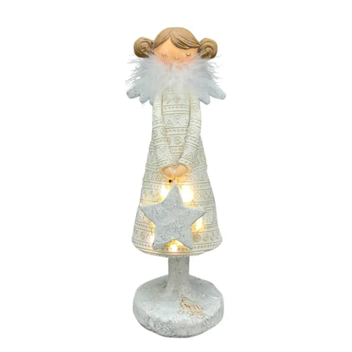 LED Engel mit Stern, schlanker Weihnachtsengel mit Federboa und Stern, 29cm