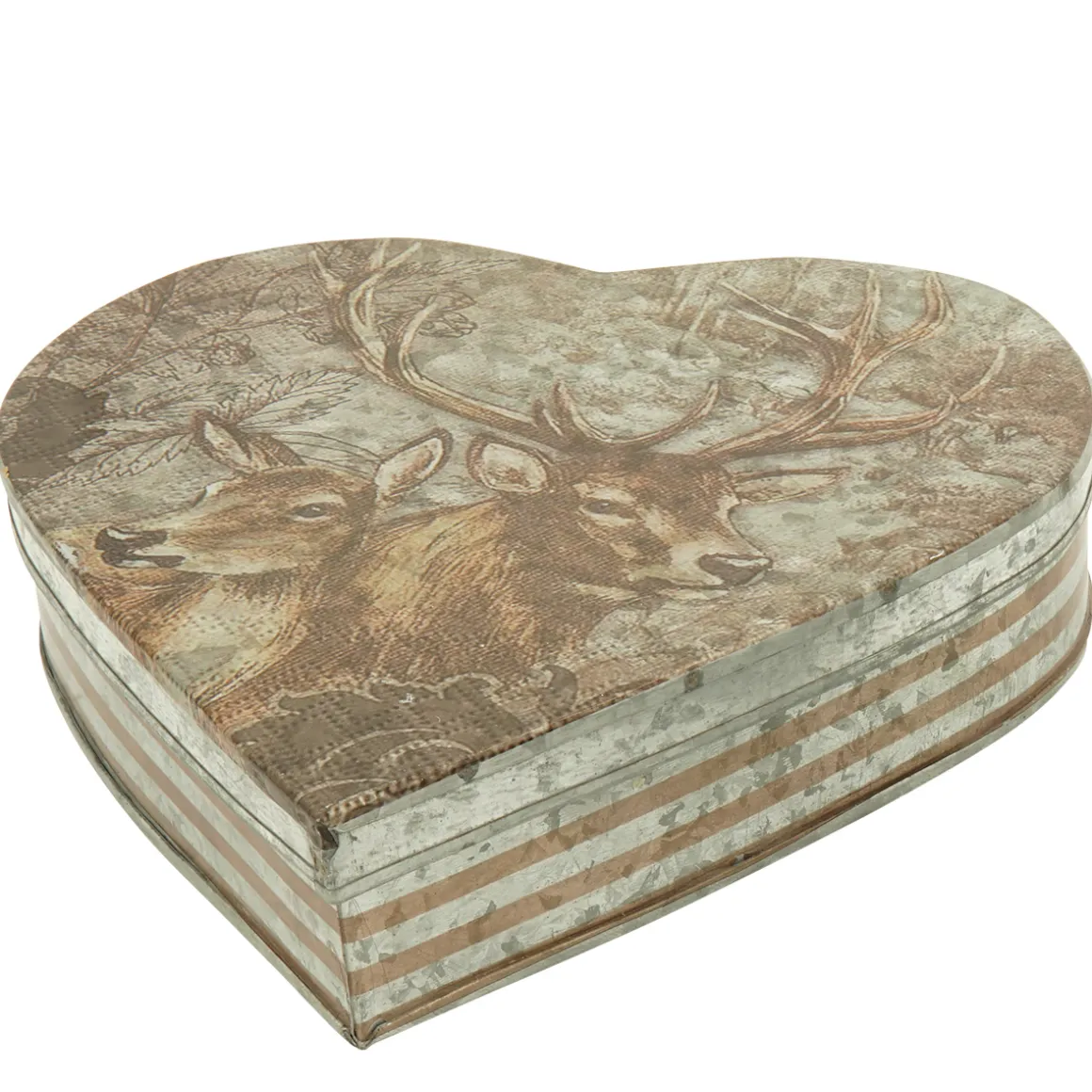 Diese herzförmige Metalldose mit detailreich geprägtem Hirschmotiv auf dem Deckel ist ein stilvoller Blickfang und vielseitig einsetzbar.