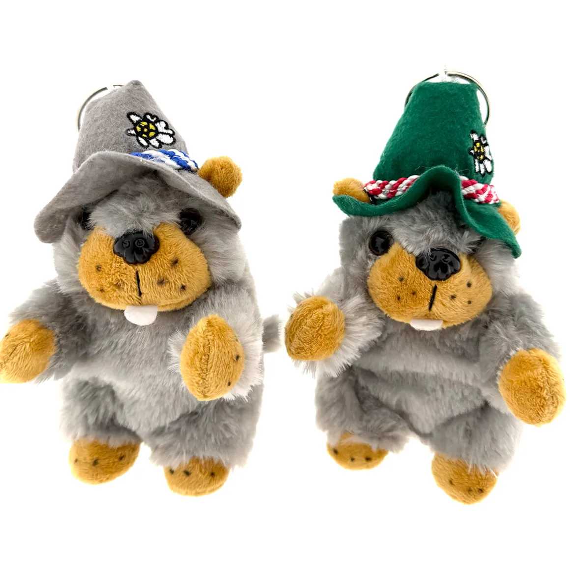 Dieses kuschelige Murmeltier trägt entweder einen grünen oder grauen Hias-Hut mit Edelweiß und weiß-blauem Hutband und ist bereit für jede Bergtour, jeden Rucksack und jedes Oktoberfest.