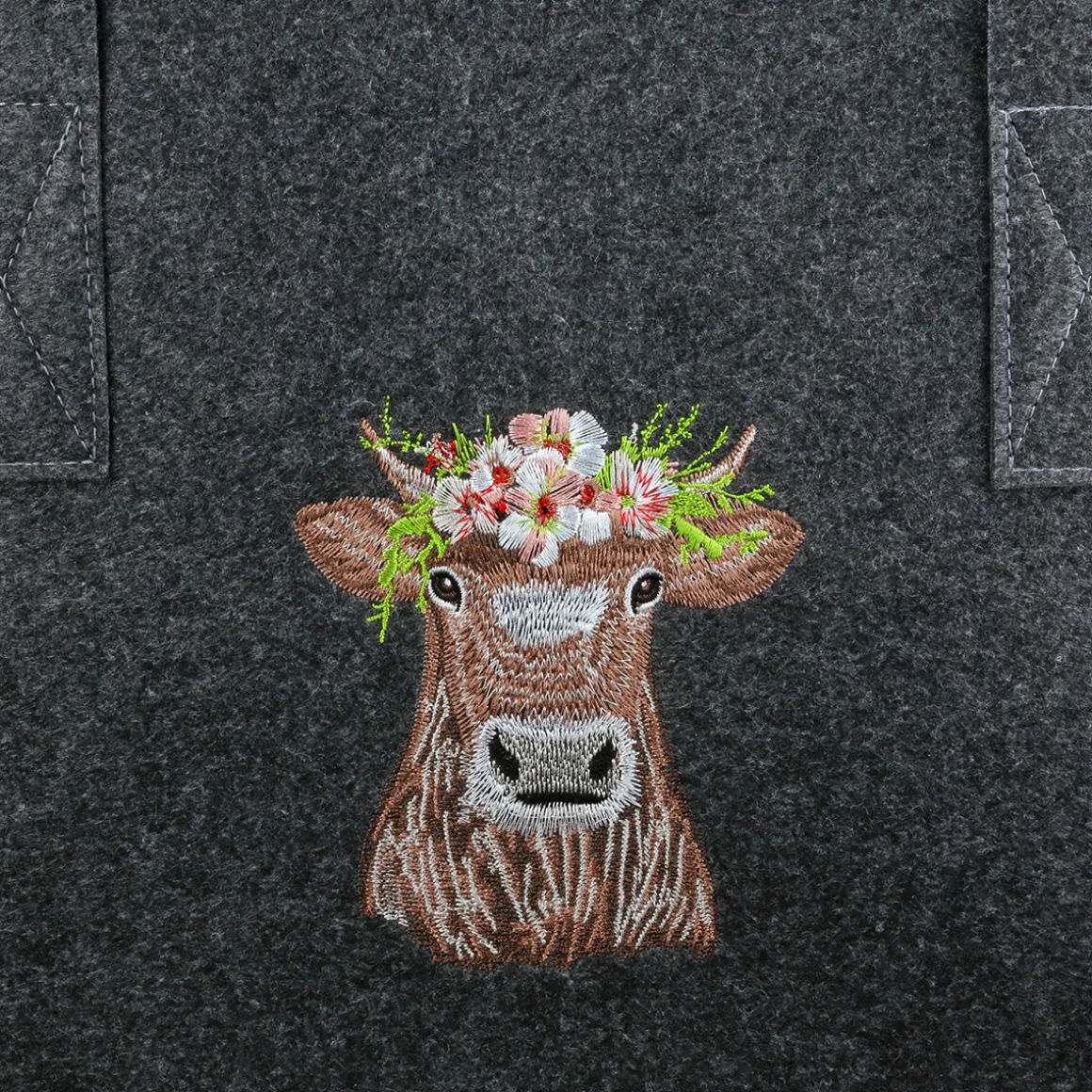 Die detailreiche Stickerei mit der Blumenkuh Adelheid verleiht der Tasche eine warme, herzliche Ausstrahlung und macht sie zu etwas ganz Besonderem.