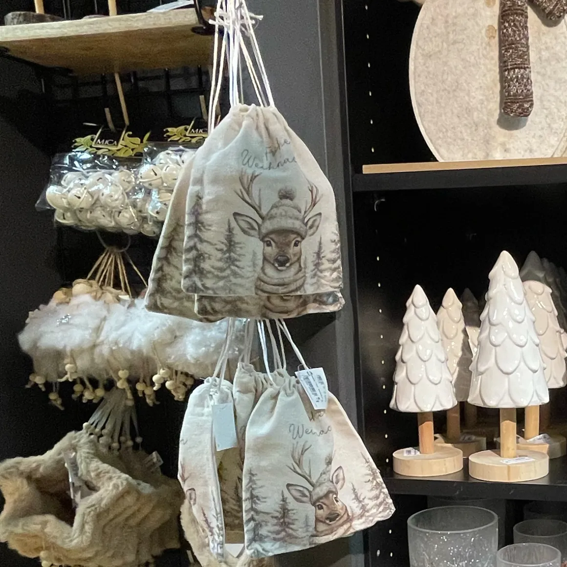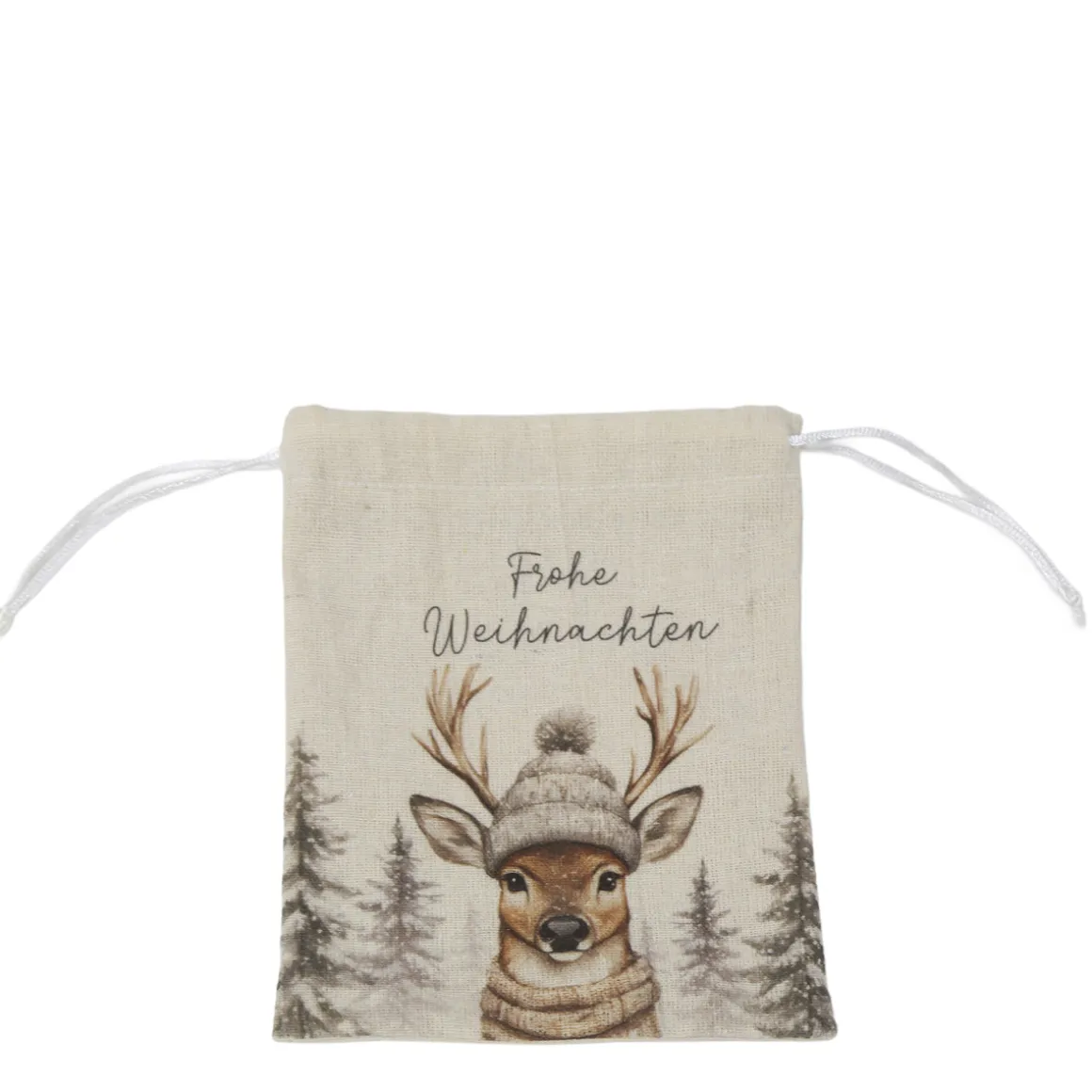Stoffbeutel Frohe Weihnachten, Jutesäckchen mit Winter-Hirsch, 16x19cm