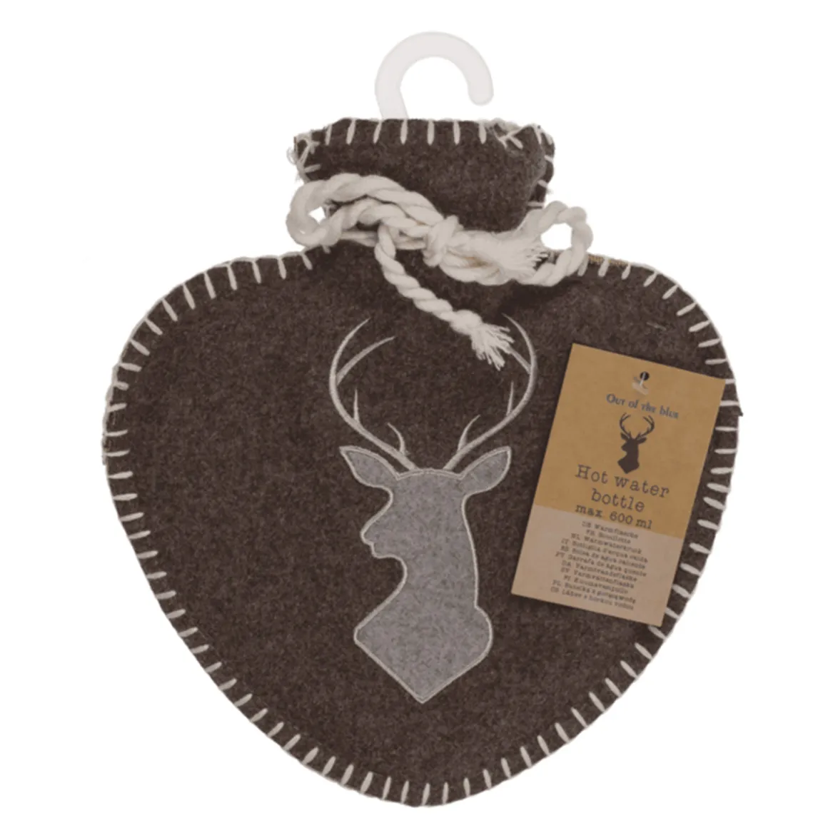 Wärmflasche Landhaus Hirsch, Herzform, Filzbezug mit Hirschmotiv und Kordel, braun-grau