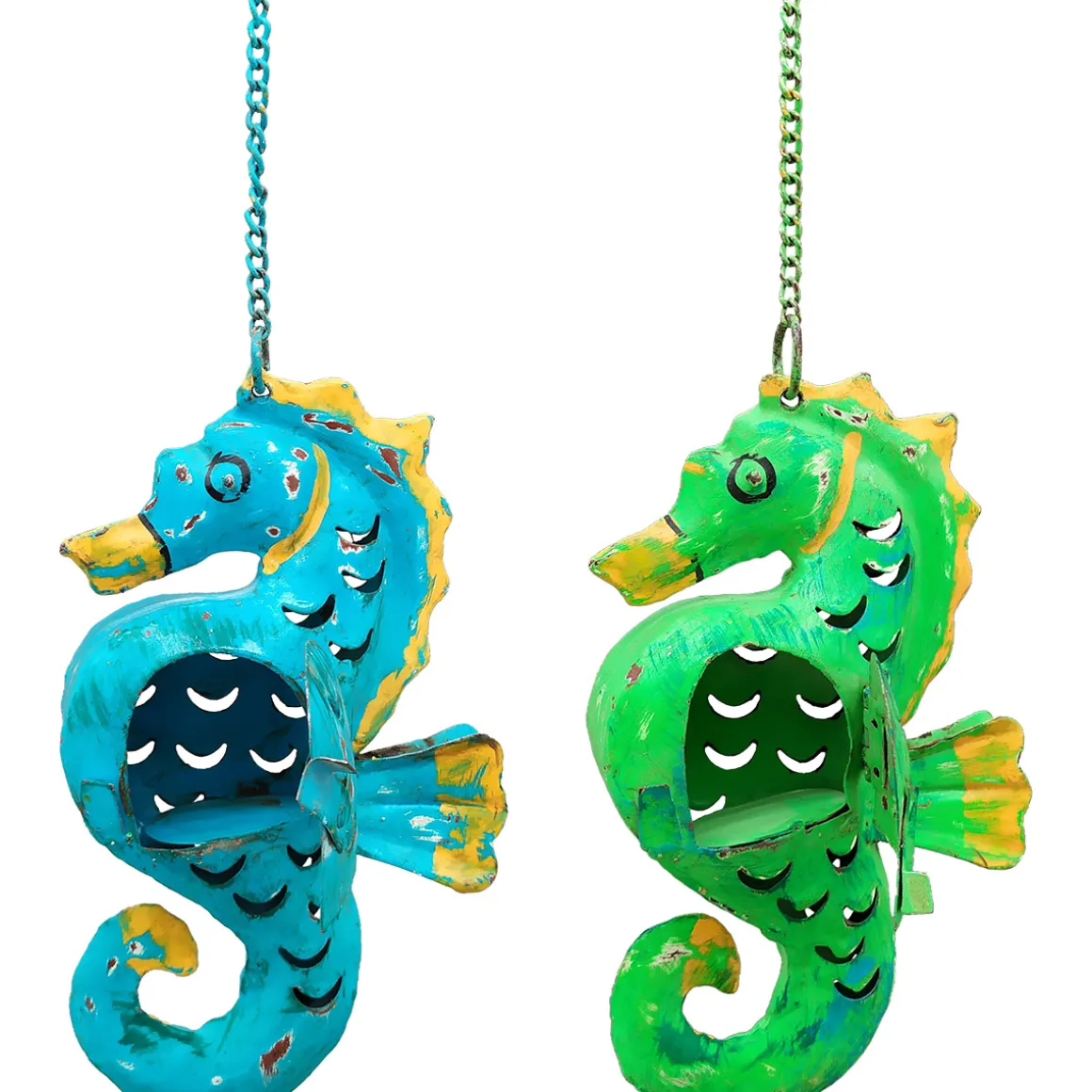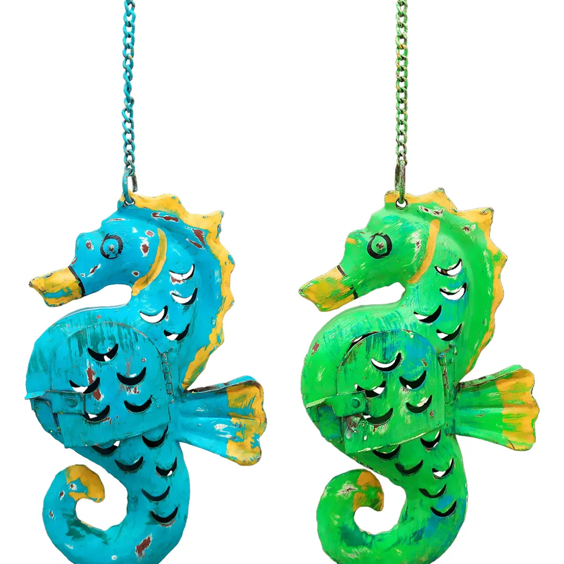 Windlicht Seepferdchen zum Hängen grün, Seepferdchen mit kleinem Türchen, 22cm, Metall