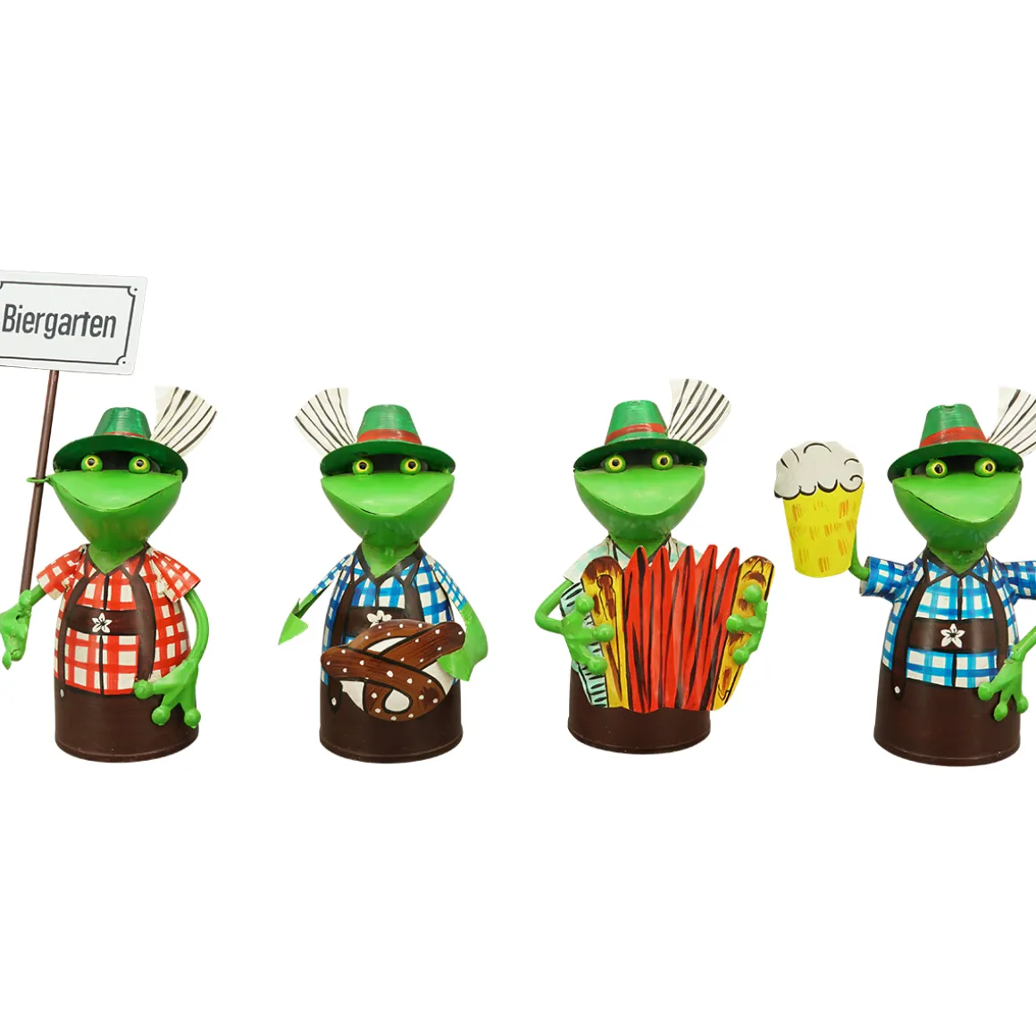 Zaunhocker Frosch Landhaus, Metallfrosch in Lederhose mit Schild Biergarten, 20cm